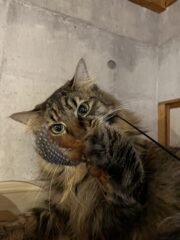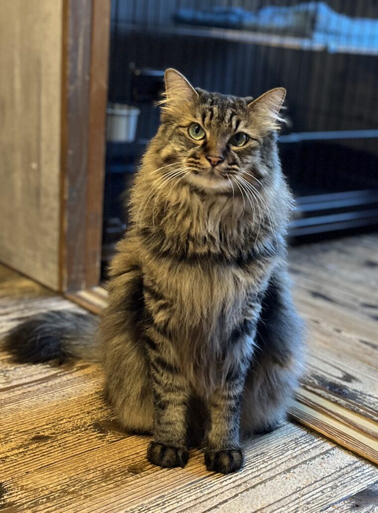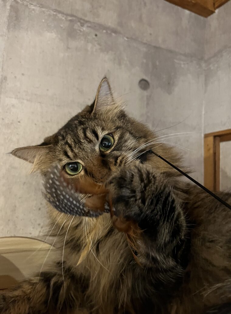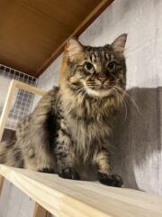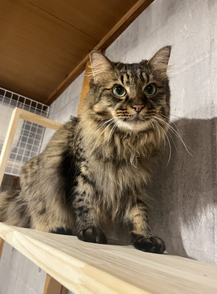 | 性格 | まだ人が怖くてシャーシャーしちゃう、人慣れ訓練中の子。普段はキャットウォークの上にひっそり隠れてますが、本当は遊ぶのが大好きな男の子。羽のおもちゃを見ると目を輝かせ、夢中になって遊んでくれます。警戒心と好奇心とで「あわわ…」ってなってる姿がたまらなく可愛い‼︎慣れた人の前ではリラックスしてる姿も見せてくれ、おやつも手から食べてくれます。猫ちゃんにはデレデレな甘えんぼ末っ子くんです! |