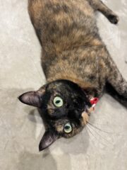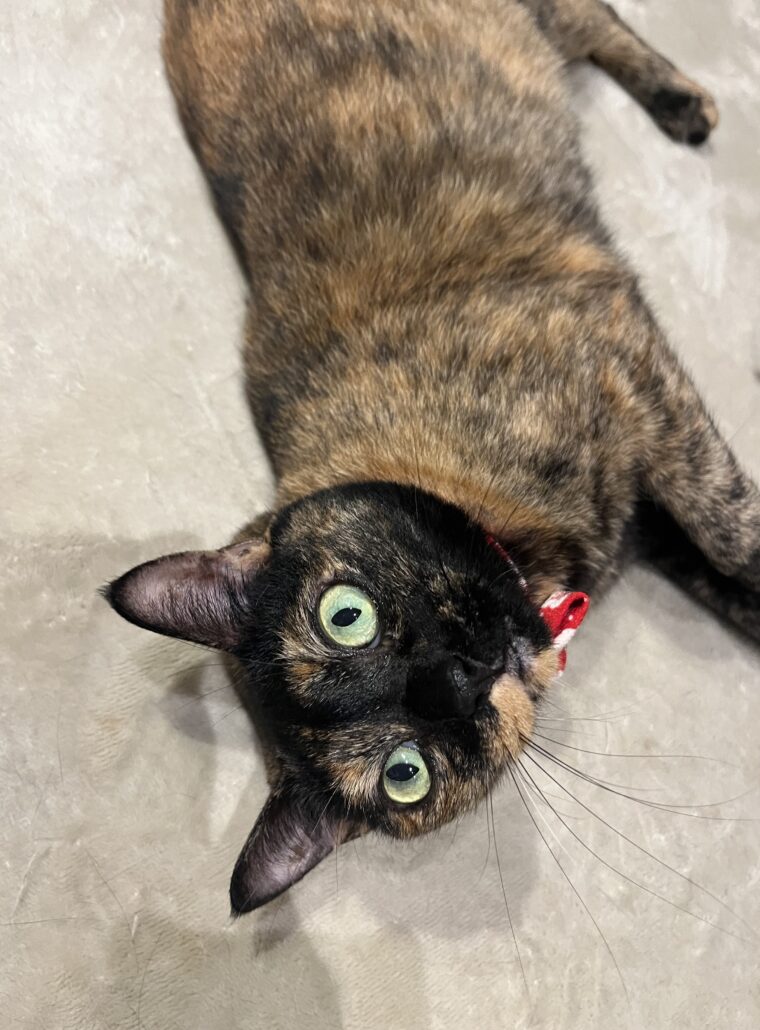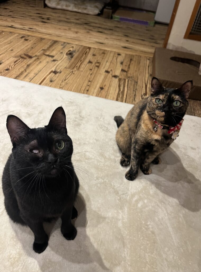 性格食べること大好きで、寝ていてもご飯が来たら起きてきます笑 黒猫の「ノエルちゃん」と姉妹。気づいたら隣に寄り添って来てくれる甘え上手さん♡伸び伸びカーペットに落ちてることが多いおっとりさんですが、おもちゃで遊ぶ時はハッスル!全体的にまん丸で、尻尾が特徴的な女の子です。