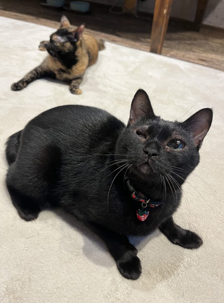 性格撫でて〜と、スリスリ寄り添って来てくれる甘え上手さん!抱っこもへっちゃらで、ごろごろ幸せエンジン音が聞こえます♡片目は萎縮してしまっていますが、生活に支障はございません。サビ猫の「ナターレちゃん」と姉妹。キラキラしたおもちゃとおやつが大好きな、尻尾が特徴的な女の子です。