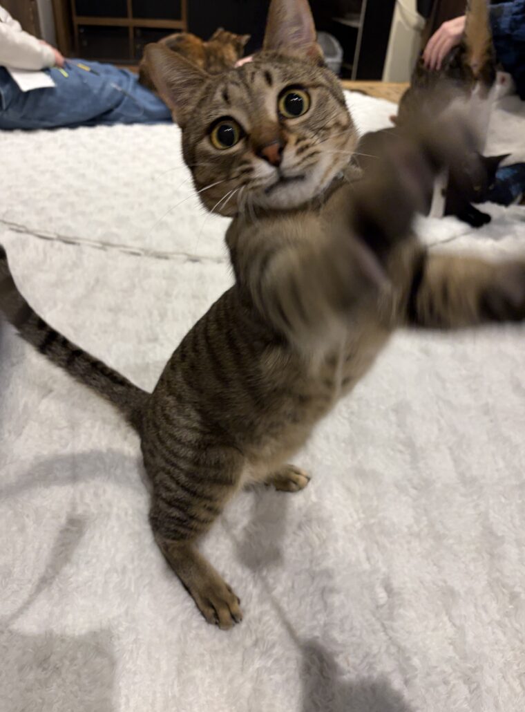 Name ラビ Data 性別男の子 毛色キジ 生年月日2025年 3月生 血液検査猫白血病【陰性】猫エイズ【陰性】 去勢手術済 マイクロチップ済 性格甘えたい時は大声で鳴いてストーカーしてくる超人馴れ抜群猫さん。ちょっと抜けてるとこあり自分のやりたい事にとことん忠実な、運動神経抜群で好奇心旺盛のやんちゃ男子!気難しい猫ちゃんにもぐいぐい行き、半ば強制的に猫社会に馴染み込むのがラビくんスタイル✨感情が表情に出ちゃうくらい分かりやすい可愛い子です♡